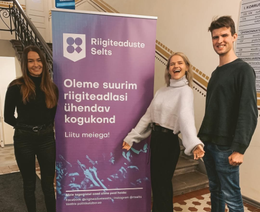 President Robin Liiber (keskel) ning asepresidendid Ronja Ansmann (kätel) ja Marten Aun (vasakul). Sügisese üldkoosolekuga loodi ka kantsleri ametikoht, mida hakkas täitma Carl Aadam Vihrov (paremal).